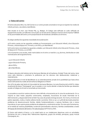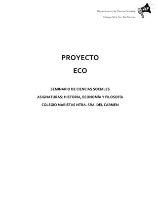 Este documento describe un proyecto de seminario de ciencias sociales en el Colegio Ntra. Sra. Del Carmen. El proyecto tiene como objetivo desarrollar habilidades en los estudiantes como el trabajo en equipo, la creatividad y la investigación. También busca fomentar el gusto por el aprendizaje y revalorizar las humanidades y el pensamiento crítico. El proyecto responde a necesidades del alumnado como prepararse para estudios superiores y del centro de ofrecer una educación integral.