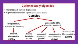 La ecografía del embarazo múltiple se utiliza para determinar la corionicidad, amnionicidad y detectar anomalías en el embarazo de gemelos. Las complicaciones, como el síndrome de transfusión feto-fetal y la restricción de crecimiento, son más frecuentes en embarazos multifetales, con un aumento de la mortalidad perinatal. Se recomienda un control prenatal riguroso y ecografías periódicas para manejar los riesgos asociados.