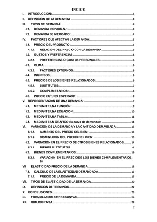 Este documento presenta una introducción al concepto de demanda en economía. Define la demanda como la cantidad de un bien que los consumidores están dispuestos y en condiciones de adquirir a un precio específico. Explora los tipos de demanda individual y de mercado, y los factores que afectan la demanda como el precio del producto, gustos e ingresos. También analiza conceptos como bienes sustitutos y complementarios y cómo sus precios afectan la demanda de otros bienes. Finalmente, explica cómo representar gráficamente una curva de dem