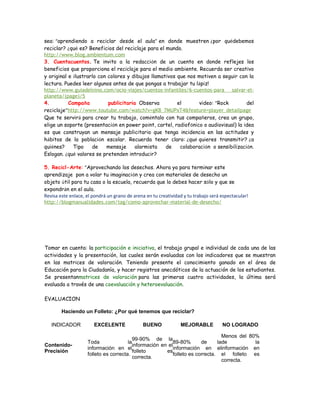 Este documento presenta una webquest para sensibilizar a los estudiantes sobre la importancia del reciclaje para la conservación ambiental. La webquest guía a los estudiantes a través de varias actividades como la creación de folletos, videos, murales y cuentos sobre el reciclaje, así como una campaña publicitaria. El objetivo principal es que los estudiantes comprendan la importancia del reciclaje y aprendan cómo separar los desechos correctamente para aprovecharlos.