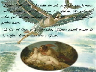 Júpiter visita regularmente la región de Arcadia para coquetear con las ninfas, pero un día manda a la ninfa Eco a entretener a Juno para distraerla. Cuando Juno descubre el engaño, maldice a Eco para que solo pueda repetir las últimas palabras de otros. Más tarde, Eco se enamora de Narciso pero él la rechaza, llevándola a refugiarse en soledad y morir de amor no correspondido.
