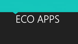 Este documento presenta información sobre aplicaciones móviles relacionadas con la ecología y el medio ambiente. Describe brevemente 12 aplicaciones diferentes, incluidas Good Guide, Carbon Footprint, iRecycle, GOGreen, WWF Together, GiveO2 y EcoCharger, y proporciona una descripción general de sus funciones, como recomendar productos ecológicos, calcular huellas de carbono y ofrecer consejos sobre reciclaje y estilos de vida sostenibles. También incluye información sobre sistemas operativos como Android, iOS, Linux y