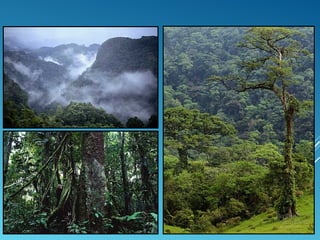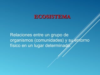 El documento describe los principales ecosistemas terrestres y acuáticos. Explica que los ecosistemas son grupos de organismos y su entorno físico en un lugar determinado. Describe los ecosistemas acuáticos como ríos, lagos, humedales y mares, e incluye ejemplos de cada uno. También describe los principales biomas terrestres como bosques tropicales, sabanas, desiertos y tundras, señalando sus características climáticas y de vegetación.