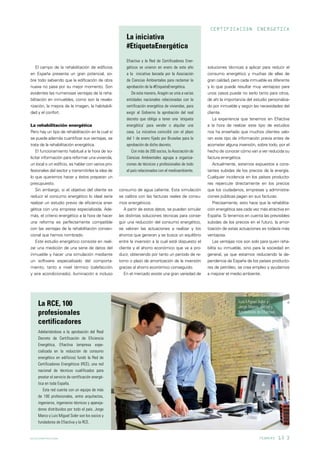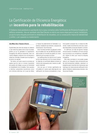 La certificación energética de edificios existentes promoverá la rehabilitación y mejora de la eficiencia energética de los inmuebles. El documento discute cómo la nueva normativa requerirá una calificación energética para la venta o alquiler de propiedades y creará trabajos en sectores como la reforma. También destaca cómo los estudios de eficiencia energética pueden identificar soluciones para reducir costos y cómo la rehabilitación energética beneficia a propietarios, sociedad y medio ambiente.