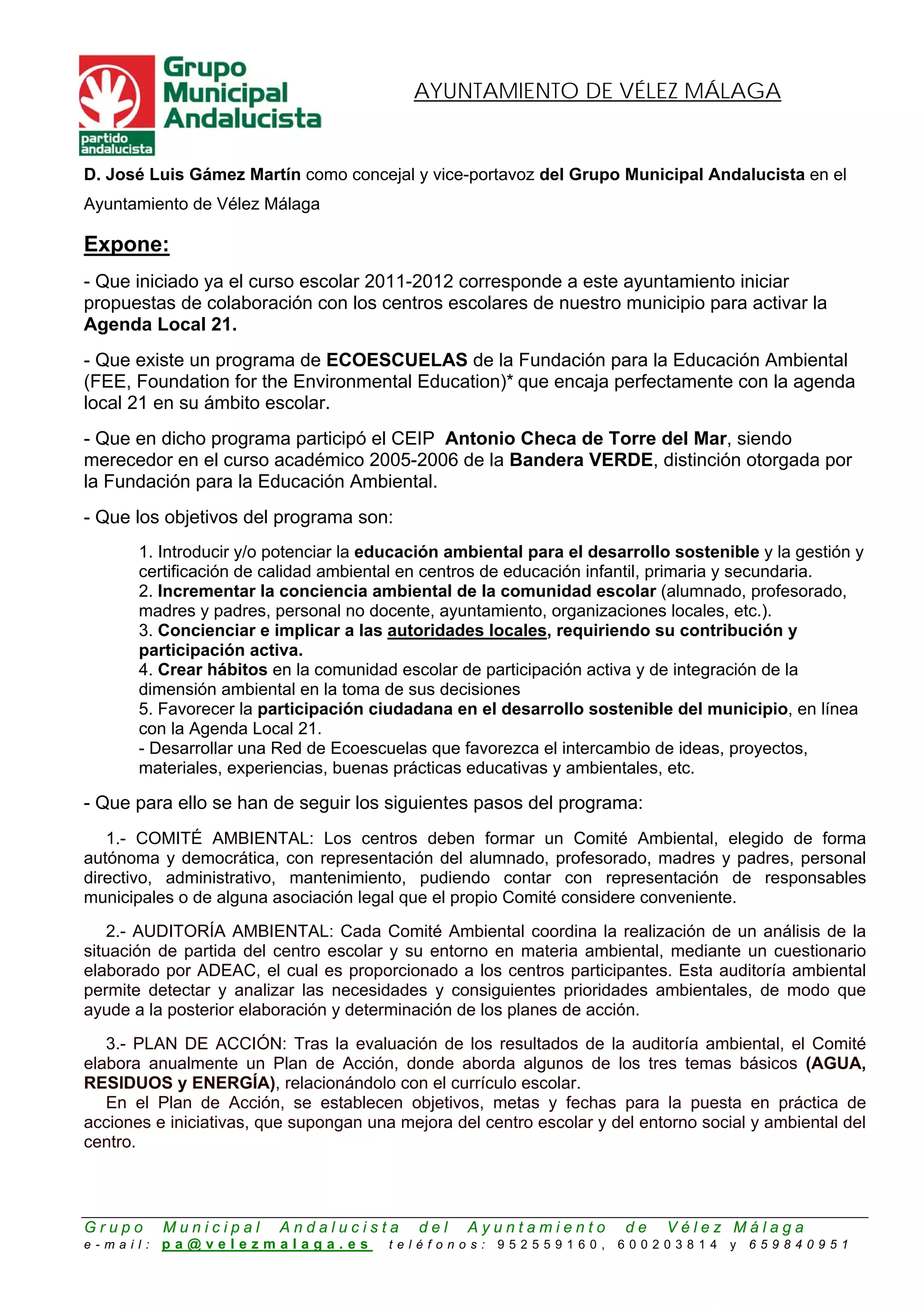 El concejal José Luis Gámez propone al ayuntamiento de Vélez Málaga que colabore con los centros escolares locales en el programa Ecoescuelas para promover la educación ambiental. Este programa involucra a la comunidad escolar en auditorías, planes de acción y códigos de conducta sobre temas como agua, residuos y energía. Se solicita la participación activa del ayuntamiento en estas iniciativas para fomentar hábitos sostenibles.