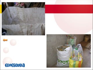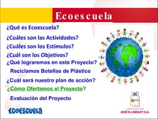 El documento presenta un proyecto de Ecoescuela que busca crear conciencia ambiental en estudiantes a través del reciclaje de botellas plásticas. El proyecto incluye capacitación a promotores, implementación de un plan educativo ambiental en cada escuela con actividades de sensibilización, recolección y venta de botellas plásticas, y estímulos para docentes y estudiantes por su participación. El objetivo es reducir el consumo de plástico y manejarlo adecuadamente mientras se desarrollan capacidades para