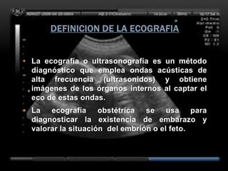 Este documento resume los aspectos fundamentales de la ecografía por trimestres durante el embarazo. En el primer trimestre, la ecografía se usa para identificar el saco gestacional, el embrión, la actividad cardíaca y detectar posibles malformaciones. En el segundo trimestre, se realiza una evaluación anatómica detallada del feto. En el tercer trimestre, se evalúa el crecimiento fetal, la posición y la anatomía, así como posibles patologías de la placenta o el líquido amniótico.