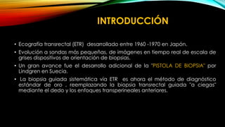 Este documento describe la anatomía y ecografía de la próstata y el cáncer prostático. Explica que la ecografía transrectal guiada es el estándar de oro para la detección del cáncer de próstata mediante biopsias sistemáticas. Describe la apariencia normal y anormal de la próstata en ecografía, incluidas las características del cáncer como nódulos hipoecoicos o asimetrías. También discute técnicas como el Doppler para mejorar la detección, ya que no todos los cáncer