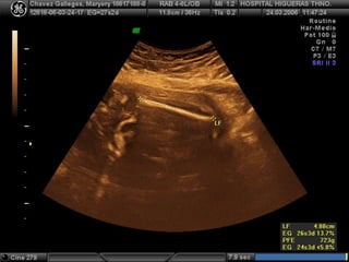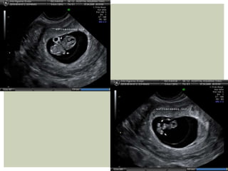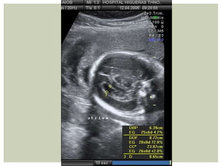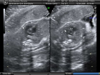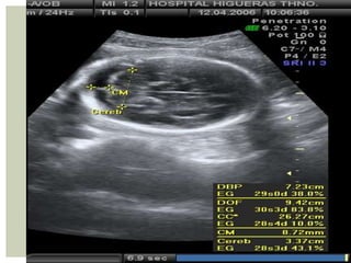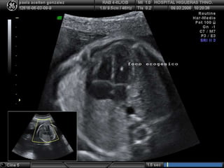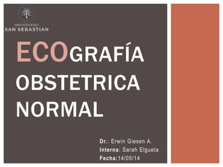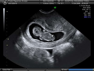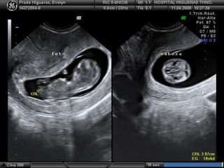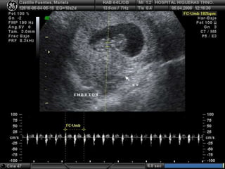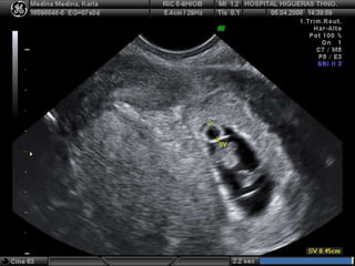 Este documento presenta los resultados de una ecografía obstetrica normal realizada en el primer trimestre de embarazo. En 3 oraciones o menos, resume lo siguiente: la ecografía mostró un saco gestacional, un embrión y actividad cardíaca normales que confirman un embarazo evolutivo de aproximadamente 6 semanas. La ecografía no detectó ninguna anomalía fetal.