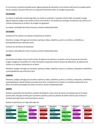 El documento presenta el plan de actividades para el ecohuerto del instituto durante el curso escolar. Se detalla el calendario mensual, incluyendo la preparación del terreno, siembra, trasplante y recolección de cultivos, así como charlas y visitas sobre agricultura ecológica. El objetivo es usar el huerto como herramienta educativa a través de diferentes asignaturas.