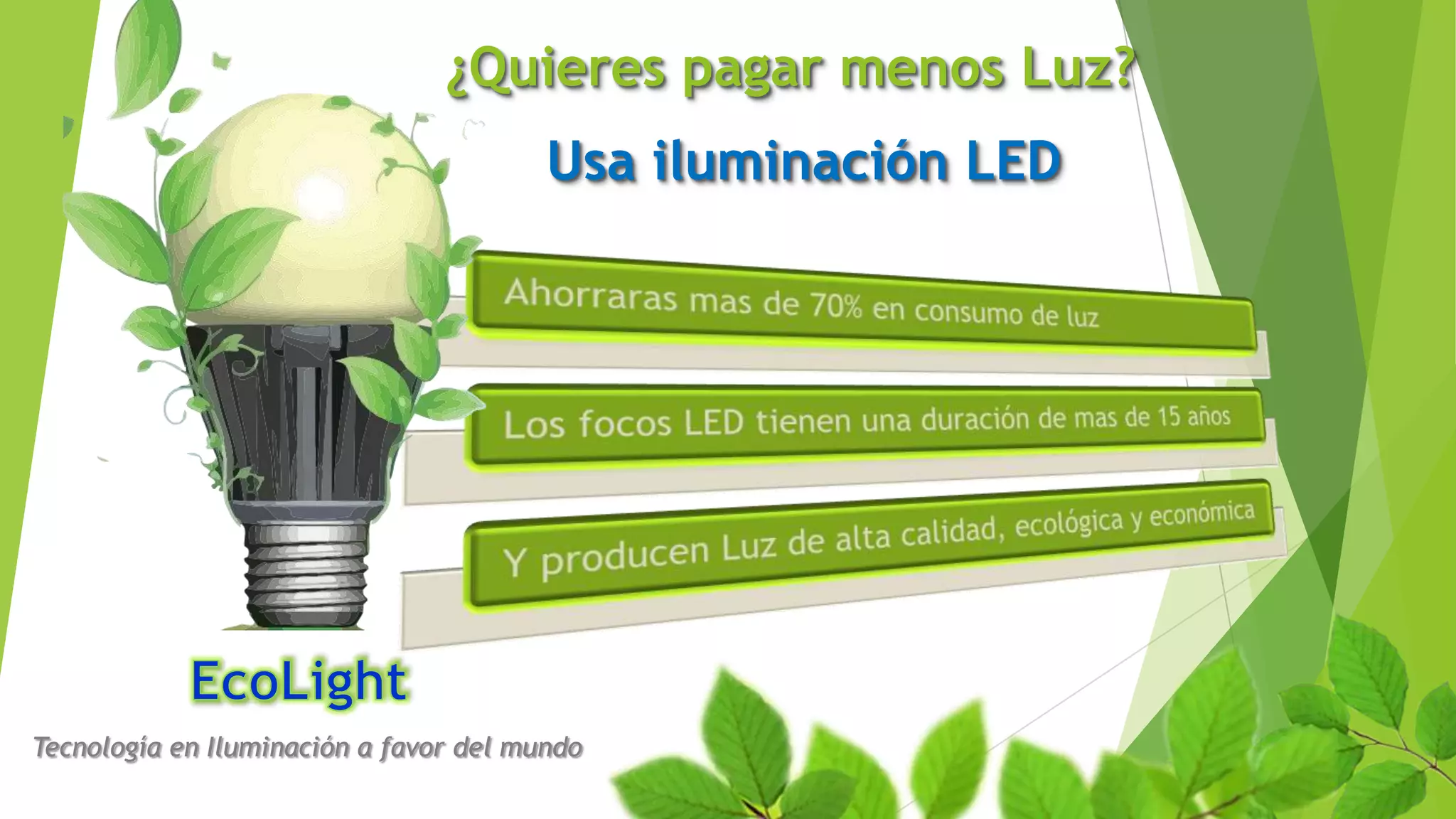 El documento describe las ventajas de usar iluminación LED sobre focos tradicionales y de bajo consumo. Los focos LED duran mucho más, hasta 30,000 horas, lo que reduce los costos de iluminación a largo plazo. La compañía EcoLight ofrece una variedad de soluciones LED, como focos, paneles, proyectores y lámparas de calle, que brindan luz clara de manera económica y ecológica.