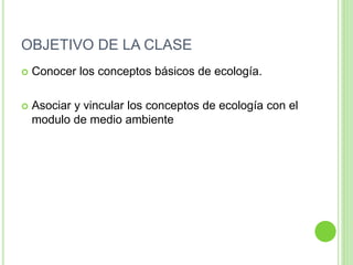 El documento proporciona una introducción a los conceptos fundamentales de la ecología. Define la ecología como la ciencia que estudia las interacciones entre los seres vivos y su ambiente. Explica que la ecología puede estudiarse a diferentes niveles de organización, como los organismos, las poblaciones, las comunidades y los ecosistemas. También describe conceptos clave como las cadenas tróficas, el flujo de energía, y la producción y productividad dentro de los ecosistemas.