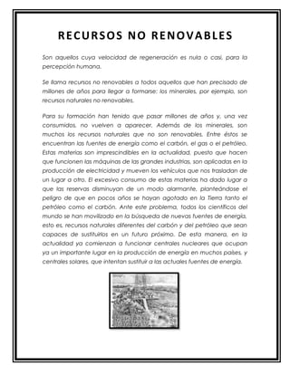 Los recursos no renovables son aquellos cuya velocidad de regeneración es nula o casi nula para la percepción humana y se formaron a lo largo de millones de años, como los minerales y los combustibles fósiles. Una vez consumidos estos recursos no renovables como el petróleo y el carbón, no vuelven a formarse, por lo que su uso excesivo ha dado lugar a que las reservas disminuyan de modo alarmante.