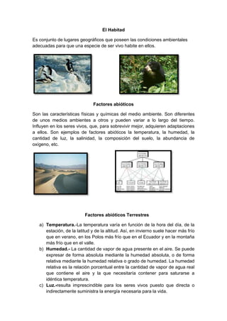 El documento resume los conceptos fundamentales de la ecología, incluyendo la definición de ecología, ecosistema y medio ambiente. Explica los factores abióticos terrestres y acuáticos y las relaciones entre los seres vivos, incluyendo las poblaciones, comunidades, especies, competencia, depredación, parasitismo, mutualismo y cadenas alimenticias.