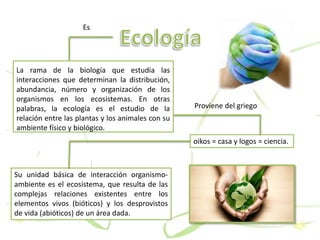 Este documento define y describe varias ramas de la ecología. Explica que la ecología es la rama de la biología que estudia las interacciones entre organismos y su ambiente. Luego describe brevemente ramas como la ecología microbiana, la biogeografía, la ecología matemática, la ecología urbana, la ecología del paisaje y la limnología. Finalmente, señala que disciplinas como la agronomía y la pesquería se relacionan con la ecología al estudiar la explotación y conservación de recursos naturales.