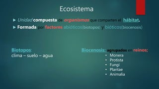 La ecología estudia las interacciones entre los seres vivos y su medio ambiente. Un ecosistema se compone de organismos que comparten un hábitat y factores abióticos y bióticos. Los recursos naturales incluyen energía renovable como la solar, así como minerales no renovables. Para conservar la biodiversidad, el Perú ha establecido Parques Nacionales, Reservas Nacionales y Santuarios, que protegen áreas naturales y sitios históricos. Sin embargo, la contaminación ambiental amenaza la vida silvestre y la salud humana
