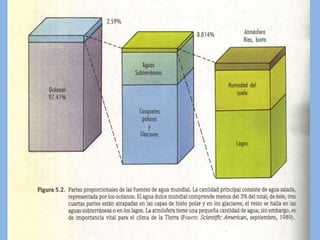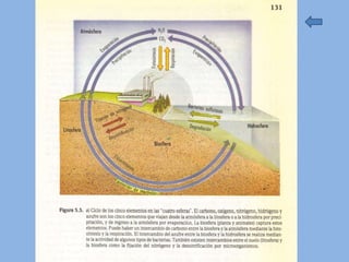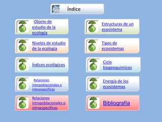 Este documento describe los conceptos fundamentales de la ecología en 3 oraciones. Explica que la ecología estudia las interrelaciones entre los organismos y su ambiente natural, y que esto se estudia a diferentes niveles como el organismo, la población y el ecosistema. También describe los ciclos biogeoquímicos que reciclan elementos entre los organismos y el medio ambiente, como el ciclo del agua.