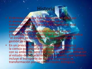 El documento presenta una introducción a la ecología, definiendo el término y su objeto de estudio. Luego describe varias disciplinas dentro de la ecología como la ecología microbiana, biogeografía, ecología matemática, ecología urbana, ecología de la recreación, ecología del paisaje y ecología regional. Finalmente, señala que disciplinas relacionadas con los recursos naturales como la agronomía y pesquería están relacionadas con la ecología.