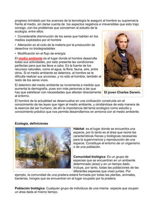La ecología estudia la relación entre los seres vivos y su entorno. La unidad básica de la ecología es el ecosistema, que incluye componentes bióticos e abióticos interrelacionados. La ecología moderna empezó con Charles Darwin y su teoría de la evolución a través de la selección natural. El deterioro del medio ambiente por las actividades humanas plantea problemas importantes para la ecología como la disminución de especies y la alteración de los ciclos de la materia y energía.