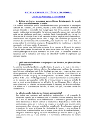 El documento describe diversas formas en que las sociedades humanas se relacionan con el medio ambiente y los recursos naturales. Algunas sociedades en países menos desarrollados dependen directamente de recursos como el agua y la leña, mientras que las sociedades más desarrolladas tienen un mayor distanciamiento del medio ambiente. El documento también discute los éxitos del movimiento ambientalista en proteger especies y reducir la contaminación, así como las definiciones de desarrollo sostenible y sociedad sostenible.