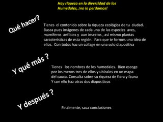El documento describe la riqueza ecológica de los humedales en el departamento del Cauca en Colombia. Menciona varios humedales importantes como el Zarzal Tambo, Las Guacas Popayán y Lago Bonanza y describe algunas de las especies de aves, mamíferos, anfibios, insectos y plantas que se pueden encontrar en la región.