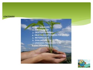 Este documento presenta el programa analítico de la asignatura de Ecología para estudiantes de Medicina Veterinaria y Zootecnia en la Universidad Autónoma "Gabriel Rene Moreno". El programa describe la justificación, objetivos, metodología, evaluación y unidades programáticas de la asignatura. El objetivo general es que los estudiantes conozcan la estructura y funcionamiento de los ecosistemas y puedan aplicar sus conocimientos en ecología en otras asignaturas y en el desarrollo sostenible de los recursos naturales.