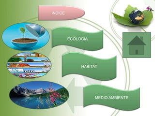 El documento define los términos ecología, hábitat y medio ambiente. La ecología es la ciencia que estudia las interacciones entre organismos y su ambiente. El hábitat es el espacio que proporciona las condiciones necesarias para que una especie viva y se reproduzca. El medio ambiente incluye todo lo que rodea a un ser vivo y afecta sus circunstancias de vida.