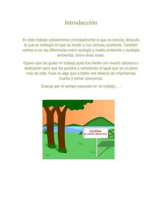 Este documento presenta una introducción a la ecología y las ciencias ambientales. Define la ecología como la ciencia que estudia la distribución y abundancia de los seres vivos y cómo son afectados por la interacción entre organismos y su ambiente. Distingue la ecología del medio ambiente y la educación ambiental. También describe las divisiones de la ecología y las ciencias auxiliares como la química, física, geografía y geología que contribuyen al estudio de la ecología.