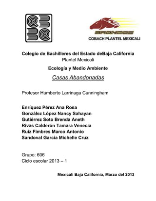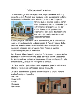 Este documento describe el problema de las casas abandonadas en la sección 3 del fraccionamiento Portales en Mexicali, Baja California. Los estudiantes visitaron el área y realizaron encuestas con residentes locales. Encontraron casas de 1 piso con ventanas y puertas destruidas, graffiti y basura. Las casas abandonadas atraen delincuencia y son utilizadas para drogas y fiestas. El documento también analiza los antecedentes del problema de casas abandonadas en Baja California y los esfuerzos del gobierno para combatirlo.