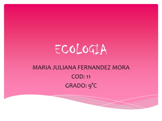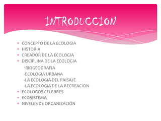 Este documento presenta una introducción a la ecología, incluyendo su historia, conceptos clave y disciplinas. La ecología estudia las interacciones entre organismos y su ambiente. Fue creada por Ernst Haeckel en 1869 y cubre temas como ecosistemas, niveles de organización biológica, y ecologistas célebres como Ramón Margalef.