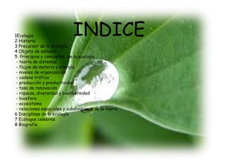 Este documento proporciona una introducción general a la ecología, incluyendo su historia, objetos de estudio principales como los flujos de energía y materia, y conceptos clave como los niveles de organización, cadenas tróficas y ecosistemas. También resume algunas disciplinas de la ecología como la limnología y la ecología del paisaje, e incluye breves biografías de ecólogos notables.