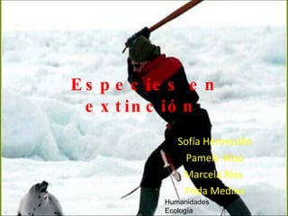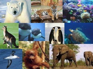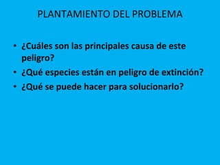 El documento describe las principales causas de extinción de especies animales, incluidas la caza excesiva, la pérdida de hábitat, la contaminación y el cambio climático. Detalla 10 especies en peligro crítico, como el oso polar, el tigre de Bengala y el orangután, y sus respectivas amenazas. Propone soluciones como la crianza en cautiverio, la protección y restauración de hábitats, campañas de concientización y castigos más severos para la caza furtiva.