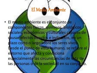 El documento habla sobre el medio ambiente y la contaminación. Explica que el medio ambiente se refiere al entorno que afecta a las personas y está compuesto de factores físicos, biológicos y sociales. Describe varios tipos de contaminación como la del agua, sonora y del aire. También cubre temas como el clima, la ecología, formas de cuidar el medio ambiente como ahorrar agua y energía, y la importancia del reciclaje.