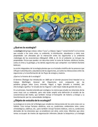 La ecología es la ciencia que estudia las interacciones entre los organismos vivos y su ambiente. Estudia factores como la distribución, abundancia y cómo estas propiedades se ven afectadas por las interacciones entre organismos y su ambiente. La ecología examina estos conceptos a diferentes niveles como poblaciones, comunidades y ecosistemas. Analiza flujos de energía y materia a través de cadenas tróficas y redes alimentarias que conectan a productores, consumidores y descomponedores.