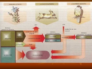Este documento describe los conceptos fundamentales de la ecología. La ecología estudia la distribución y abundancia de los seres vivos y sus interacciones con factores abióticos. Los ecosistemas están formados por comunidades de organismos que interactúan en un biotopo. La fotosíntesis es el proceso clave por el cual las plantas convierten la energía solar en energía química para alimentar las cadenas tróficas. Los ciclos biogeoquímicos mueven nutrientes esenciales a través de los ecosistem