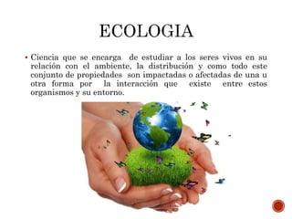 El documento describe los conceptos fundamentales de la ecología, incluyendo el nicho ecológico, el hábitat, el ecosistema, la biodiversidad y la biosfera. Explica que la ecología estudia la relación entre los organismos vivos y su entorno, y cómo cada especie ocupa un nicho ecológico particular dentro de un hábitat y ecosistema.