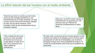 La ecología estudia la relación entre los seres vivos y su entorno, incluyendo factores abióticos como el clima y la geología, y factores bióticos como otros organismos. Analiza cómo la distribución y cantidad de organismos es el resultado de esta relación. Los seres humanos, como animales, se ven afectados por su relación simbiótica con el medio ambiente, pero a diferencia de otros animales pueden alterarlo, causando daños a la biosfera cuando su número es grande.