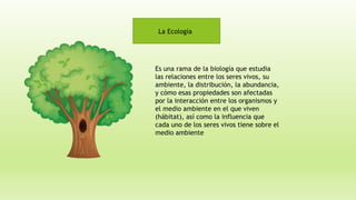 La ecología estudia las relaciones entre los seres vivos y su ambiente. Se centra en cómo los organismos interactúan con su hábitat y cómo se afectan unos a otros. Algunas ramas principales de estudio de la ecología son la autoecología, que estudia a los individuos; la demografía, que estudia las poblaciones; y la sinecología, que estudia las comunidades biológicas y ecosistemas. La ecología considera factores bióticos como los seres vivos y factores abióticos como el agua, la temperatura y