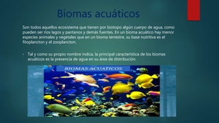 Este documento describe los principales sistemas acuáticos, incluyendo biomas acuáticos, ecosistemas lénticos y lóticos. Los biomas acuáticos se caracterizan por tener agua como biotopo y tener menos especies que los biomas terrestres. Los ecosistemas lénticos incluyen lagos, humedales y estanques con aguas estancadas, mientras que los ecosistemas lóticos como ríos y arroyos tienen aguas que fluyen constantemente.