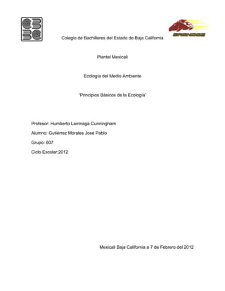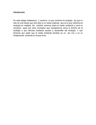 Este documento resume los principios básicos de la ecología. Define la ecología como la ciencia que estudia las interacciones entre los organismos y su ambiente. Explica que la ecología se divide en autoecología, que estudia las adaptaciones de una especie; demoecología, que estudia las poblaciones de una especie; y sinecología, que estudia las comunidades biológicas. También discute las ciencias auxiliares a la ecología como la meteorología, paleontología, genética y microbiología. Concluye enfatizando la importancia