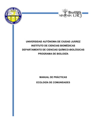 Este documento presenta el manual de prácticas de ecología de comunidades de la Universidad Autónoma de Ciudad Juárez. El manual contiene 20 prácticas sobre diversos temas de ecología de comunidades como la caracterización de comunidades, delimitación de comunidades, factores abióticos en el agua, métodos de muestreo y análisis de vegetación, diversidad alfa y beta, estructura de comunidades, similitud entre comunidades, sucesión y complementariedad. El manual provee información detallada sobre los objetivos