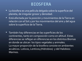 Los documentos tratan sobre ecología y ecosistemas. La ecología estudia la interacción entre organismos y su medio ambiente. La biosfera incluye todos los ecosistemas de la Tierra, que contienen componentes bióticos y abióticos que interactúan. Los ecosistemas se estudian a través de los ciclos de nutrientes, las relaciones alimentarias y los flujos de energía.