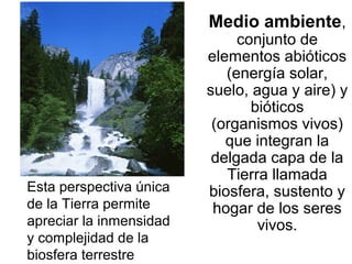 El documento trata sobre ecología y educación ambiental. Explica conceptos clave como medio ambiente, ecología, ecosistema, biota, biosfera, biomas, componentes bióticos y abióticos, ciclo trófico, pirámide trófica, flujo de energía, y niveles de organización biológica. Resalta la importancia de la relación entre organismos y su medio ambiente físico y biológico.
