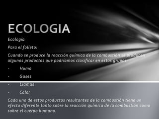 El documento describe los diferentes productos que se generan durante una combustión y sus efectos. Estos productos incluyen humo (que puede ser de diferentes colores dependiendo del material quemado), gases (algunos tóxicos que pueden causar desde mareos hasta la muerte), llamas y calor (cuyas altas temperaturas pueden causar golpes de calor, quemaduras o incluso la muerte después de varias horas de exposición). También explica cómo la falta de oxígeno debido al fuego puede llevar a síntomas como pérdida de coordinación