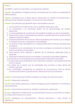 El documento resume las leyes ambientales de México, incluyendo la Ley General del Equilibrio Ecológico y la Protección al Ambiente. Describe los principios, instrumentos y capítulos de la ley, incluyendo la planeación ambiental, áreas naturales protegidas, y la protección de flora y fauna. Los estudiantes analizan que la ley protege los ecosistemas como un patrimonio nacional y que es responsabilidad de todos mantener el medio ambiente en equilibrio para mejorar la calidad de vida.