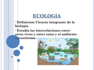 La ecología estudia las interrelaciones entre los seres vivos y entre estos y su ambiente. Un ecosistema consiste en factores bióticos como los seres vivos y factores abióticos como elementos inertes, que interactúan entre sí. Dentro de un ecosistema hay un flujo de materia y energía a través de cadenas tróficas. Los ecólogos realizan observaciones de campo, experimentos en microcosmos y modelos matemáticos para comprender estas interrelaciones y responder preguntas sobre el comportamiento de las especies.
