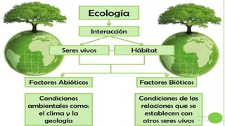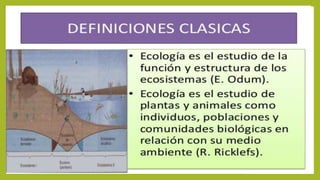 La ecología es la ciencia que estudia las relaciones entre los seres vivos y su medio ambiente. Se define como el estudio de las interacciones entre organismos y su entorno físico y biológico. La ecología examina cómo los organismos interactúan dentro de poblaciones, comunidades y ecosistemas, y cómo estos sistemas están influenciados por factores ambientales.