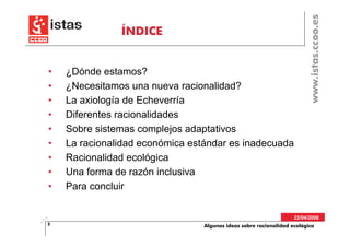 Este documento discute la necesidad de una nueva racionalidad ecológica. Argumenta que ya no vivimos en un "mundo vacío" sino en un "mundo lleno" con restricciones ecológicas globales. La racionalidad y principios que funcionaban para el mundo anterior ya no son adecuados. Se necesitan nuevas formas de pensamiento que reconozcan que vivimos en una biosfera compleja en lugar de una infraestructura humana. También explora las ideas de Javier Echeverría sobre una "ciencia del bien y del mal" que podría