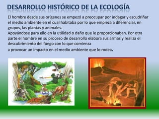 El documento trata sobre la ecología y el medio ambiente. Explica que desde sus orígenes, el hombre ha indagado y diferenciado plantas y animales en su medio ambiente, causando un impacto a medida que desarrolló herramientas. La ecología se originó en el siglo IV a.C. con Aristóteles, quien explicó la interrelación de los seres vivos con el medio ambiente. A lo largo de la historia, científicos como Darwin investigaron la distribución de especies y su relación con el medio, mientras