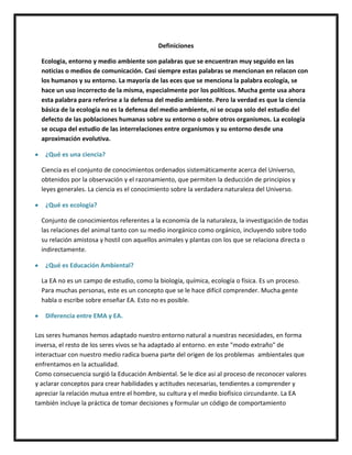 Este documento presenta definiciones y principios básicos de la ecología y la educación ambiental. Explica que la ecología estudia las interrelaciones entre organismos y su entorno, mientras que la educación ambiental es un proceso para comprender y apreciar la relación entre el hombre, su cultura y el medio ambiente. También describe las divisiones de la ecología como la ecología microbiana, la biogeografía y la ecología urbana. Finalmente, enfatiza la urgencia de continuar investigando la ecología para comprender ecosistemas y especies antes de que des